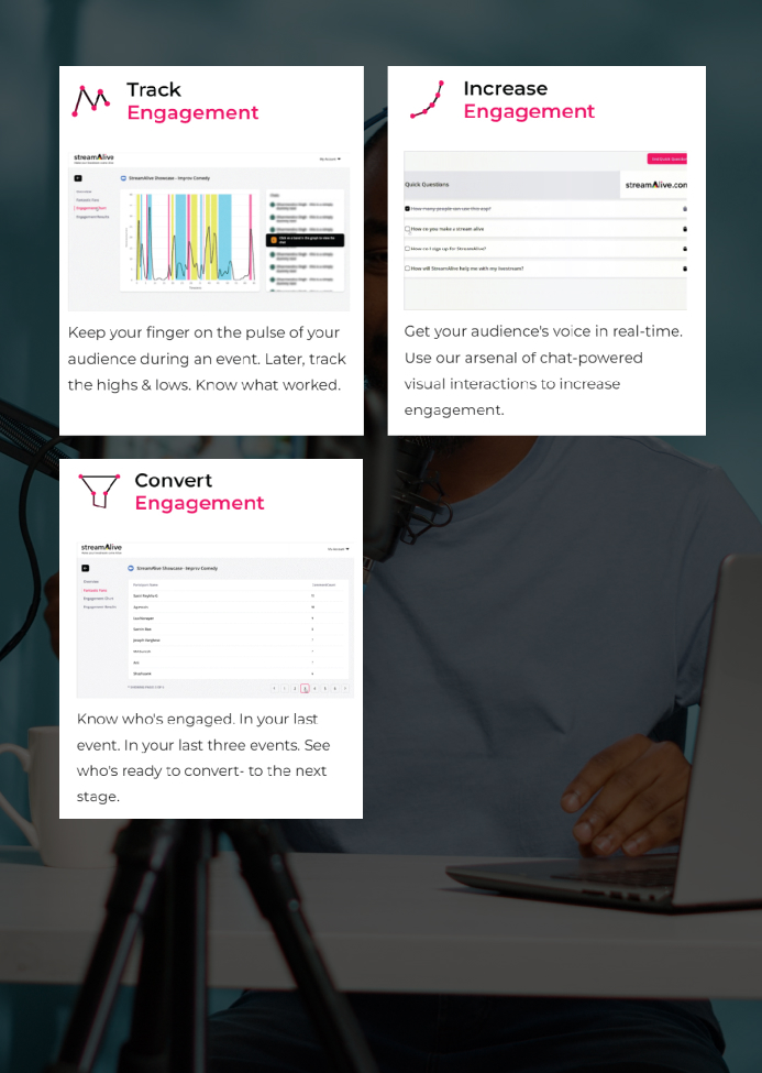 StreamAlive helps creators to plan, track, analyze and increase live audience engagement on multiple platforms enabling them to provide meaningful online experiences and presentations.